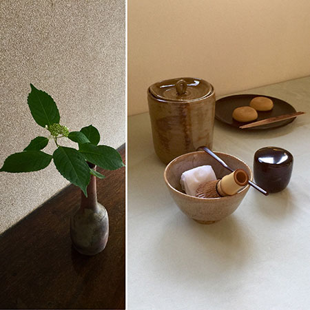 伯父の茶碗、祖母の水指、花入は岡本規子さん作。